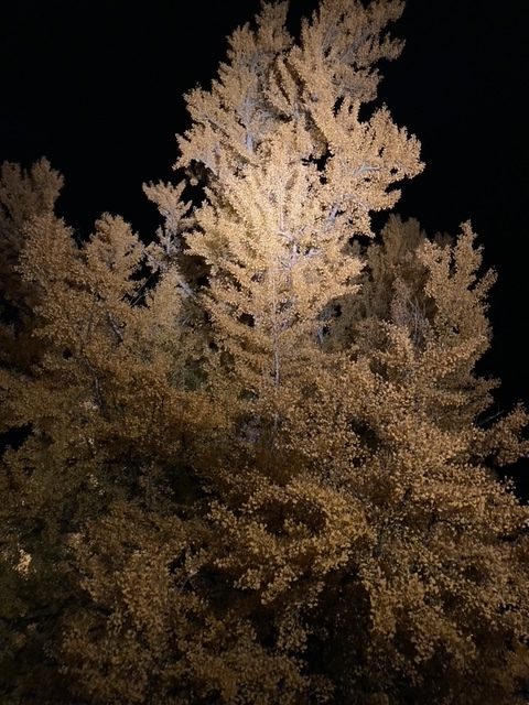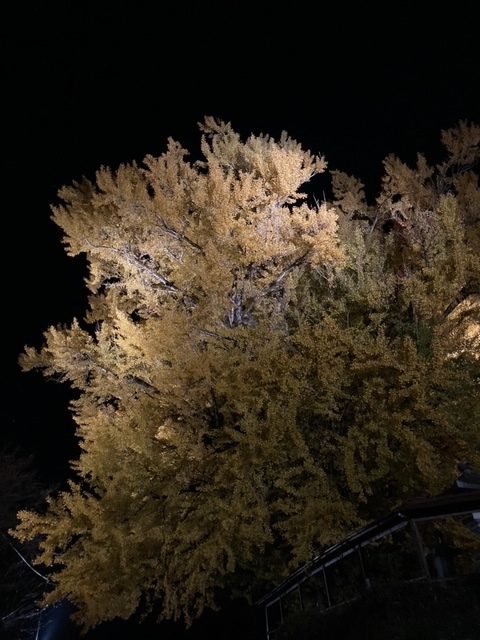 夜になるとライトアップされ、暗闇に黄色いイチョウの葉が輝いていました。