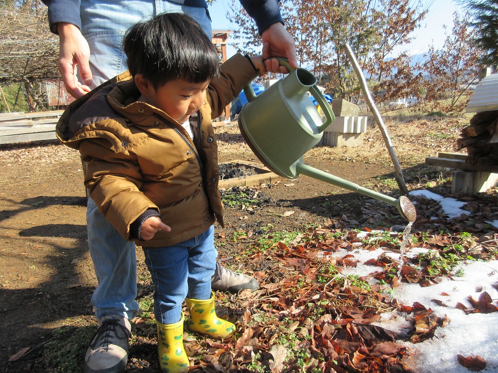 庭で遊ぶ、そうすけくん。雪にジョーロで水をかけとても楽しそうです。
