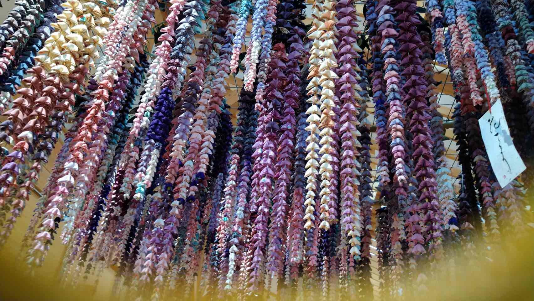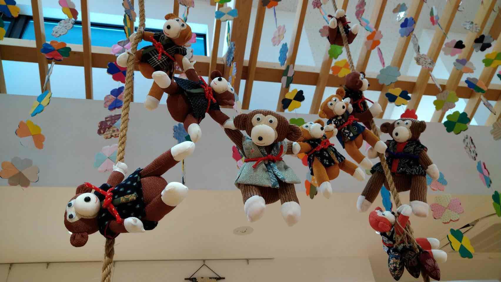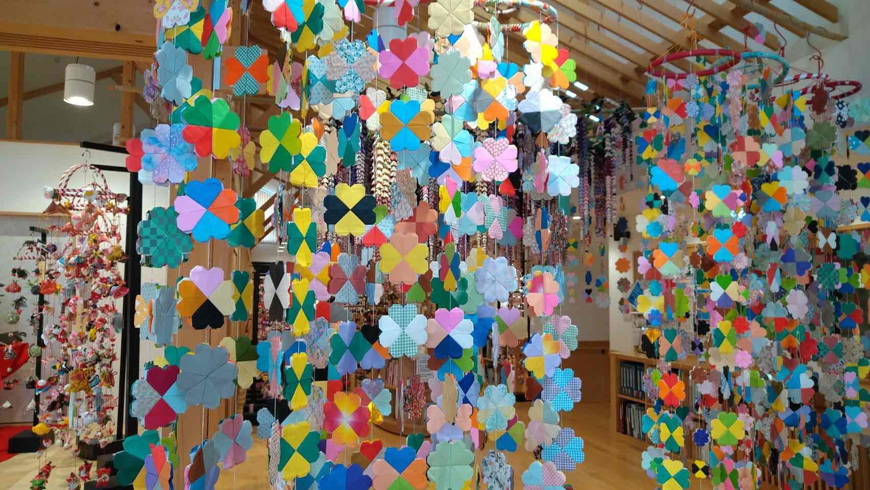 阿木の子どもたちが織った折り紙のつるし飾りがお出迎え。