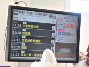 バス車内前方にはデジタルサイネージが2台あり、路線・料金の表示や市内企業の広告が流れていました。