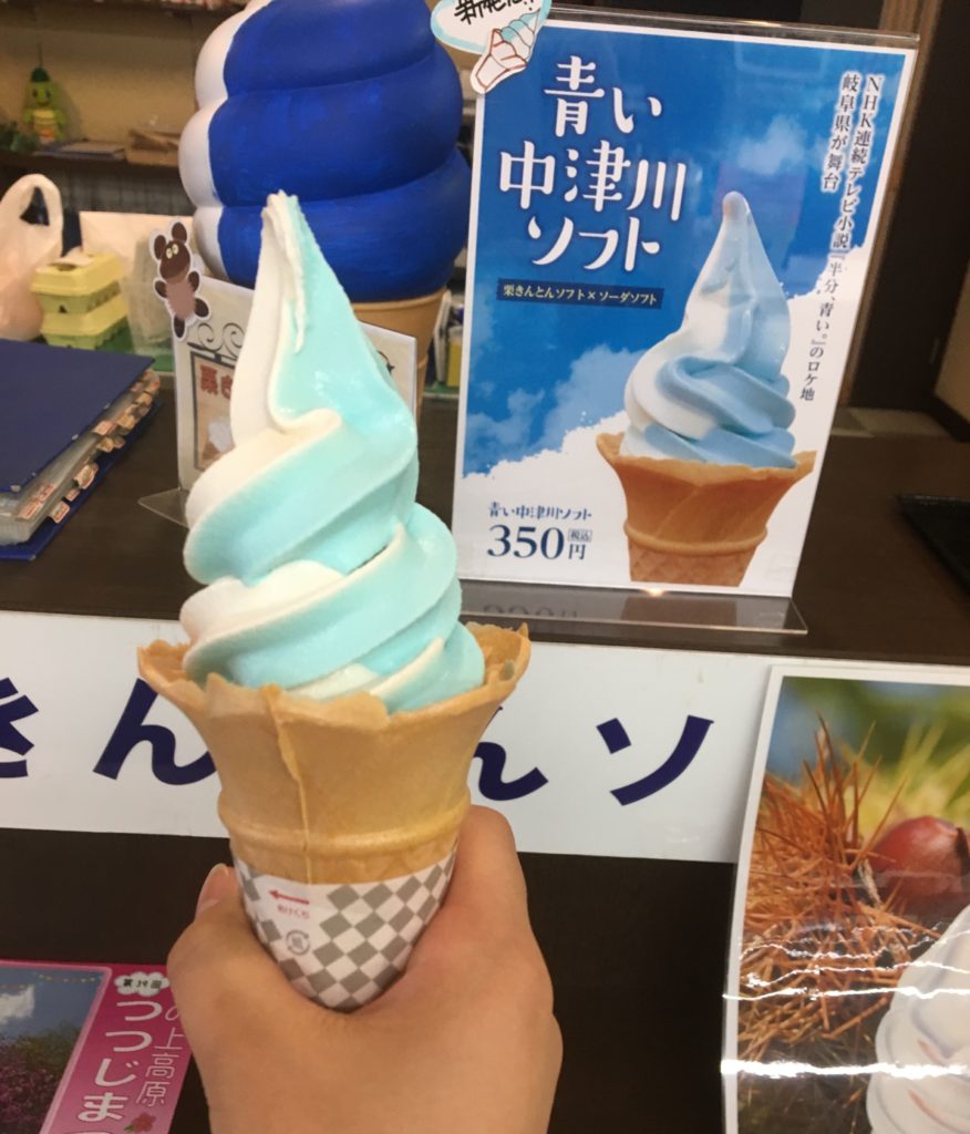 中津川駅前のにぎわい特産館では、「青い中津川ソフト」が販売されています。