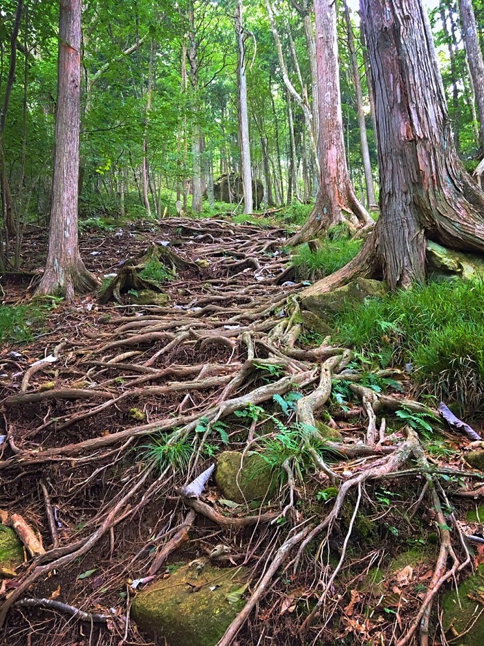 整備された道、きれいな緑に癒されていると、次第に道が険しくなり・・・