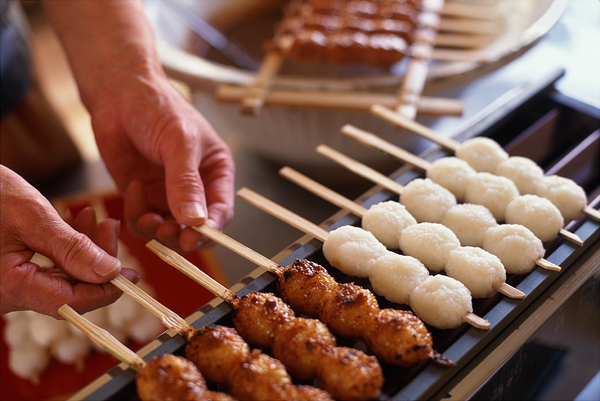 六斎市ごへーまつりでは、市内の店舗がそれぞれ自慢の五平餅を販売!