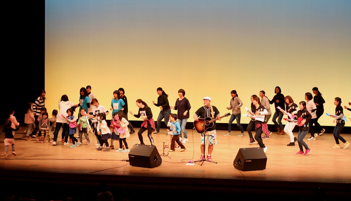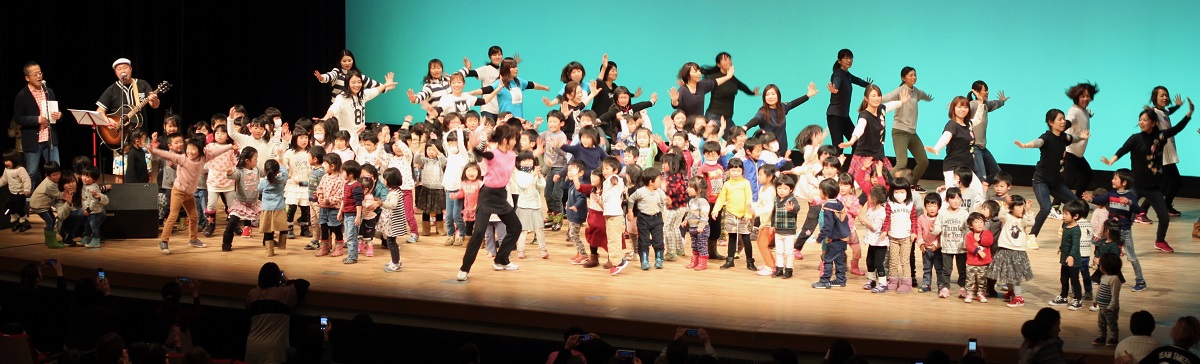 お披露目会は、大勢の子どもとお父さんお母さんが参加し、たにぞうさんの伴奏に合わせて、中津川少年少女合唱団が歌い、市内保育園・幼稚園の先生有志が踊り、最後は子どもたちも舞台に上がり、一体となって歌って踊って楽しみました。